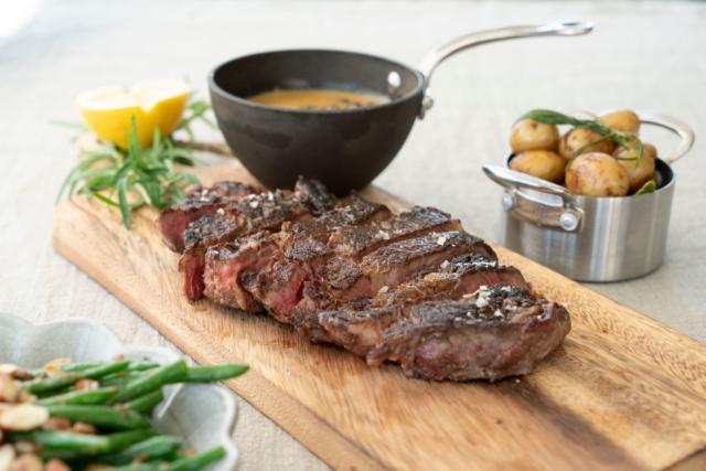 Tricket för att lyckas med entrecôte att steka på hög värme under kort tid. Använd gärna en kolstålspanna när du steker, eftersom pannan ger en jämn värmespridning till köttet och tål höga temperaturer. Kolstål fungerar på alla värmekällor – till och med öppen eld. Om du ska steka flera biffar och inte har plats i stekpannan, kan du bryna dem i pannan och låta dem gå klart i ugnen. Alternativet är att du steker entrecôten i omgångar. De första, färdigstekta bitarna kan du sedan steka på snabbt före servering.