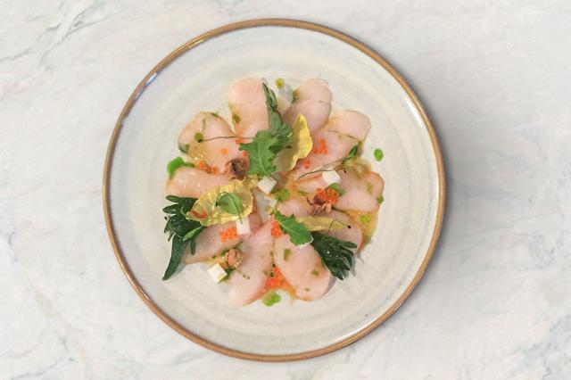 En carpaccioinspirerad rätt signerad Frida Ronge. Det är otroligt gott att dressa sashimi direkt på tallriken istället för att dippa den i soja vid sidan av. Den mineraliska smaken i ostronen blir jättegod till den råa gösen.
