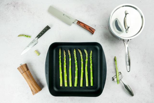 Sparrisen ligger nyskördad och klar på köksbänken. Men är du redo? Innan du sätter igång med primörpreppen är det viktigt att se över kvaliteten på de prylar som du har hemma i köket. Är du en primörfantast av rang som gärna (och ofta) sätter tänderna i en krispig sparris eller rädisa? Då är en vass skalare och en stabil grönsakskniv två måsten att ha nära till hands. Komplettera gärna med en liten allkniv, då den gör sig särskilt bra till små råvaror som kräver precision. Är det ugnsrostade grönsaker som står på menyn? Då gör du rätt i att investera i en riktigt bra roaster av hög kvalitet. Om sparrisen i stället ska kokas eller serveras med pocherat ägg har du en trofast tjänare i en rostfri kastrull. Sist men inte minst – smaksättningen. Avsluta med några drag med saltkvarnen och dina primörer är redo att serveras!