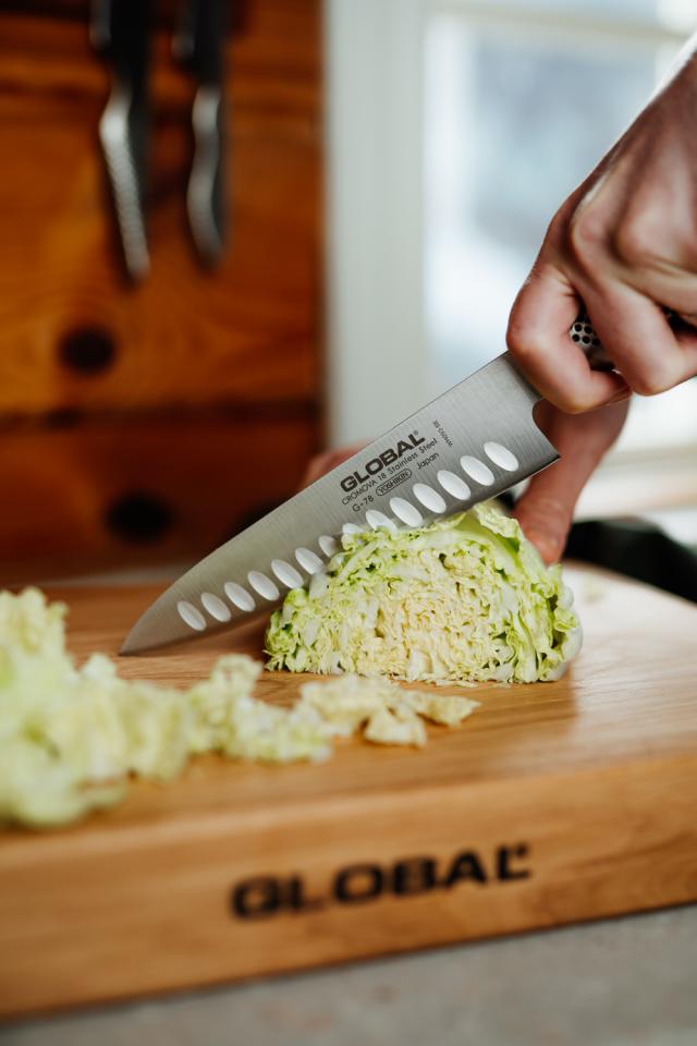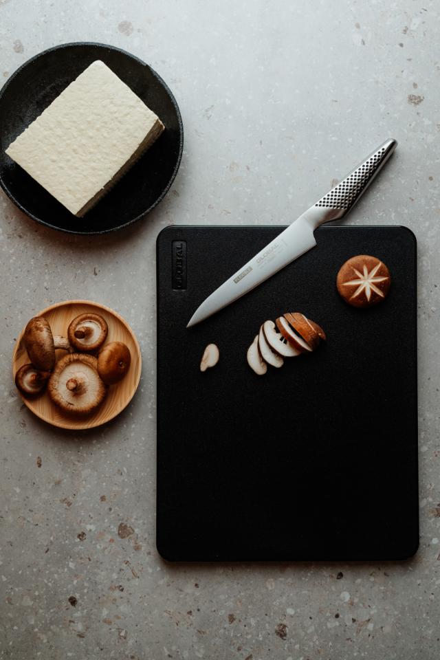 Underställ ute – underlag inne. Globals skärbräda i silverek är tålig, snäll mot kniven och har en stabil tyngd att lita på.