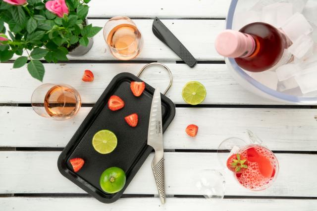 En liten skärbräda är också bra att ta med sig ut. Globals plastskärbräda är skonsam som underlag för kniven, samtidigt som den är smidig att bära med sig och snygg att servera på.