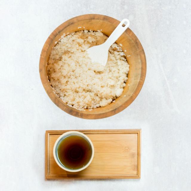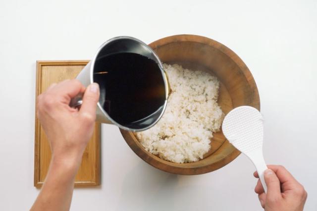 Lägg riset i en hangiri (träkärl för ris) eller en plastbunke och låt ånga av någon minut. Blanda i 0,5 dl sushi-su med en risspade eller en slickepott, lite i taget. Riskornen ska separera från varandra när man blandar med sushi su för att sen klibba ihop igen. Lägg en fuktig kökshandduk över riset för att det inte ska torka. Den sushi-su som blir över förvarar du i kylen.