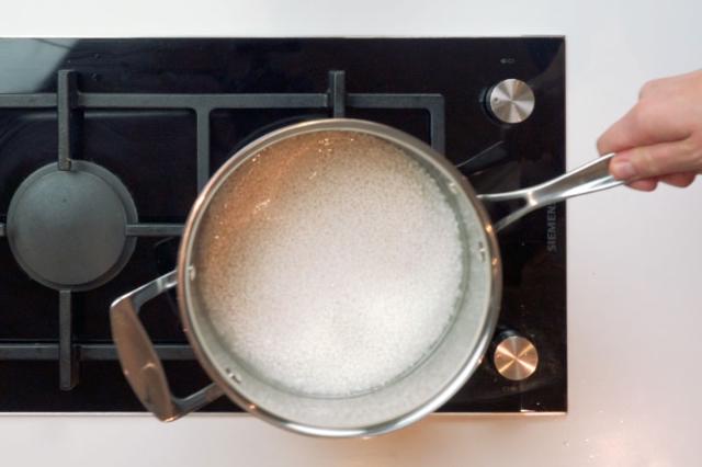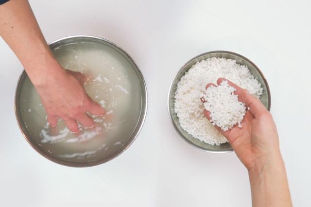 Tvätta riset försiktigt i kallt vatten. Blanda runt riset med händerna i vattnet. Byt vatten och upprepa tills vattnet blivit klart, ca fem gånger. Häll upp nytt vatten och låt riset stå i vattnet 20 minuter. Häll av vattnet.
