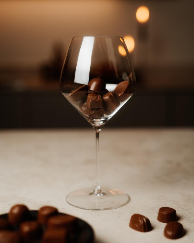 Till chokladasken är det inte fel med rött vin, gärna en fruktdriven pinot noir från Nya världen. Vinet plockar upp chokladens söta, lena smaker utan att för den skull ta över – elegant och enkelt!
