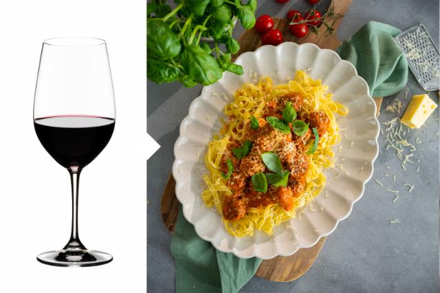 Färsk tagliatelle, hemgjorda köttbullar, mustig tomatsås – och så lite basilikablad på toppen. Hela rätten andas italienska smaker och naturligtvis ska vinet hålla samma kaliber. Vi rekommenderar ett lättare rödvin utan påtaglig strävhet, helst med inslag av färska örter. Varför inte en klassisk chianti?