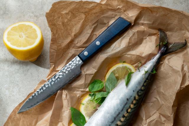 Bladet är tillverkad av Movax-stål, vilket är ett slitstarkt stål som håller sig vasst länge och är enkelt att underhålla. Hamringen ger i sin tur bladet både bättre funktion och ett distinkt, elegant uttryck. Det blåsvarta handtaget är tillverkat av pakkawood – ett tåligt och hygieniskt material som kombinerar träets känsla med hög slitstyrka – och är fastsatt med två kraftiga stålnitar för stabilitet och balans.